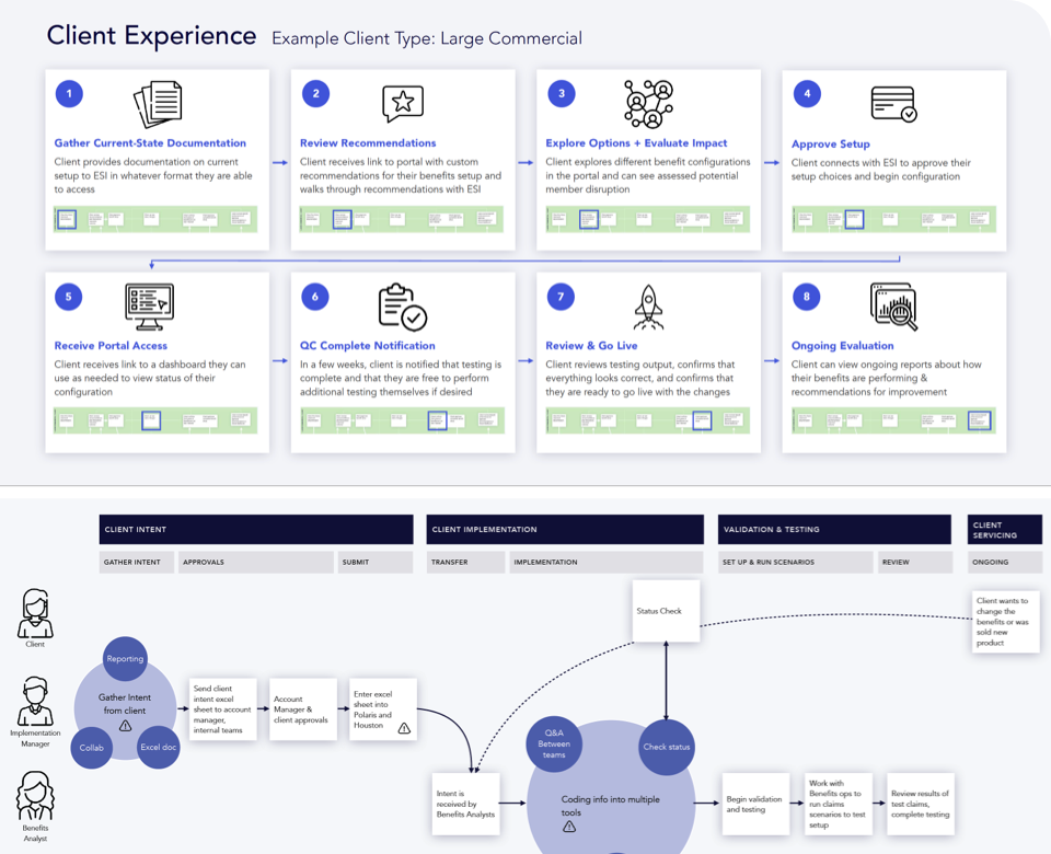- Conducted internal research and strategic alignment workshops to create a client experience-focused vision and multi-year roadmap for benefits setup used with major health plans and commercial clients